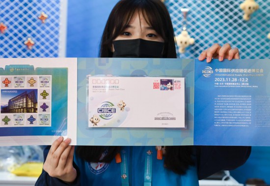 11月29日,一名在链博会文创小店服务的志愿者向记者展示带有“链氪”形象的链博会专属纪念邮折。